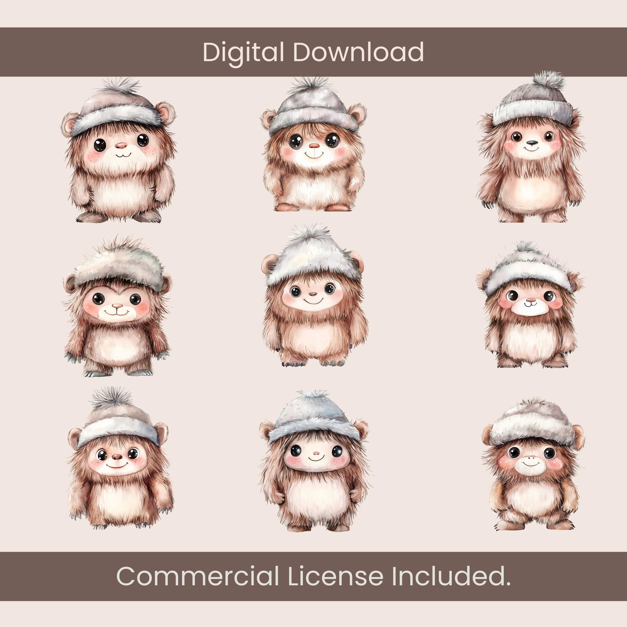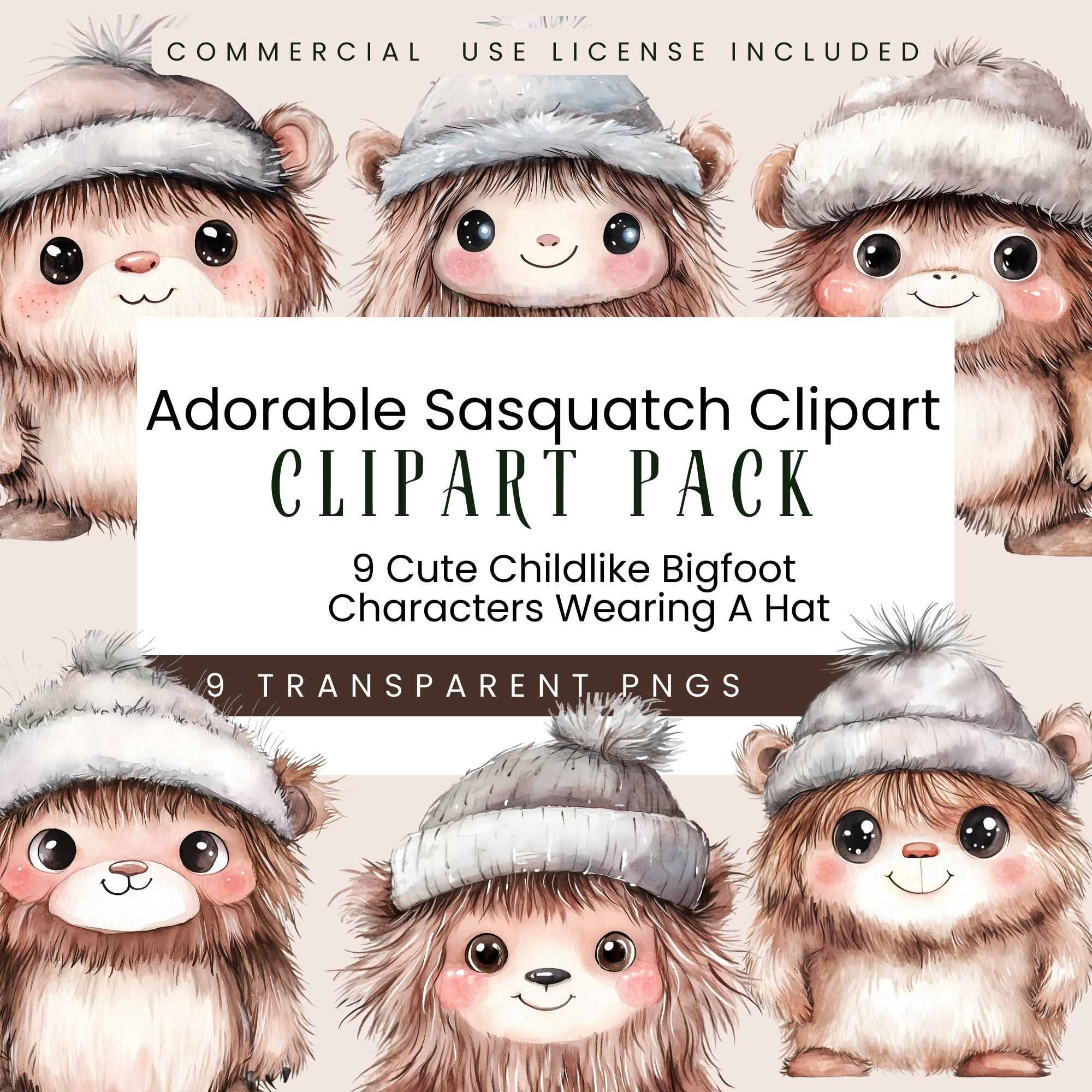 Bring some whimsical cryptid charm to your designs with this Adorable Sasquatch Clipart Set! π£π This collection features 9 watercolor childlike Bigfoot characters, each sporting a cute and cozy hat. Whether you're creating kids' party invitations, nursery decor, scrapbooking, or fun t-shirt designs, these lovable little Sasquatches are ready to add some legendary cuteness to your projects!